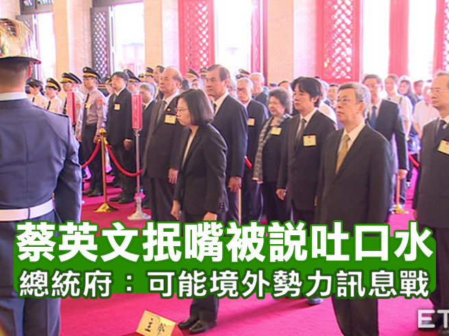 九三軍人節當天,蔡英文總統在副總統陳建仁等人陪同下,赴台北市的忠烈祠主持中華民國107年秋祭忠烈祠殉職人員典禮,網路上流傳一段影片顯示,在儀式結束後,總統蔡英文向旁邊「啐」了一口。對此,總統府發言人林鶴明表示,第一時間出現簡體字版本的訊息,可能伴同境外勢力操作的訊息戰,應該明辨並遏止假消息的傳播。