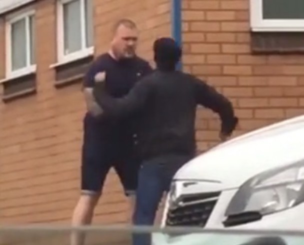 英國伯明翰市有兩名男子日前在街上發生爭執。吵著吵著,當中那名個子矮小的男子,竟然以一記左鉤拳把身材幾乎是兩倍的大隻佬當場打倒在地。這個讓人詫異的結果,連在場的旁觀者都禁不住大聲驚呼。