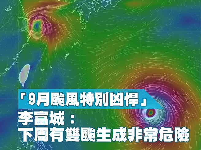李富城在臉書表示,「9月的颱風特別凶悍,而下周將有兩個颱風生成,請大家注意。」他引用歐美資料進一步分析,熱帶低壓下周三穿越巴士海峽大概會形成颱風,但往西走;值得注意的是之後關島附近有一個颱風形成,「離我們還很遠,它的走向不是不知道,不能講。」