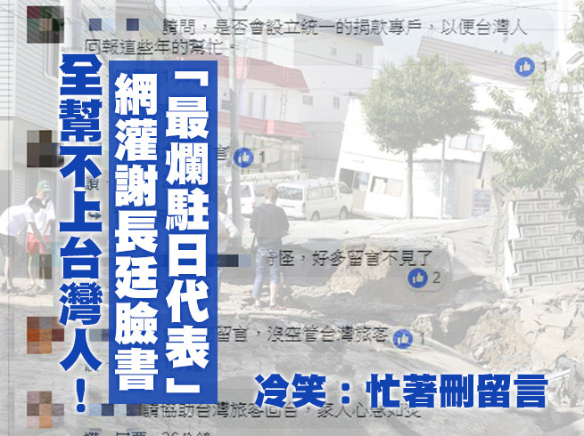 日本北海道今(6)日凌晨發生規模6.7強震,土壤液化、山坡崩落、房屋坍塌等災情頻傳,造成停水停電及交通大亂。駐日代表謝長廷中午於臉書回報,台旅客在當地的情況,並囑請旅行社維護安全;不過,網友們顯然不買單,認為危機處理太慢,就連交通住宿都無法協助,還有不少人吐槽,「忙著刪留言,沒空管台灣旅客呢!」