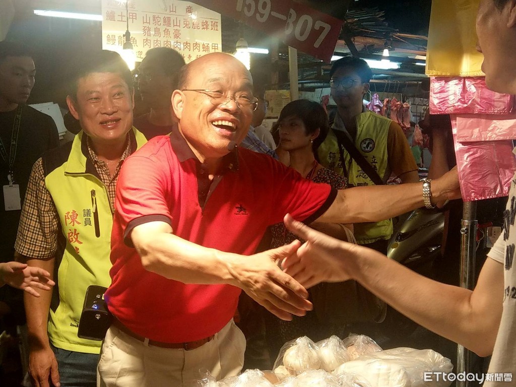 此外,蘇貞昌一早就到綠營大票倉的三重力行市場掃街拜票,穿上大紅色襯衫充滿活力,他表示自己從清晨到夜市,7日是他二十天來第26個市場,一掃常常是兩三個小時,衣服常常是從裡到外全身溼透,他笑說,「也沒幾件好穿,所以不漂亮請多原諒。」