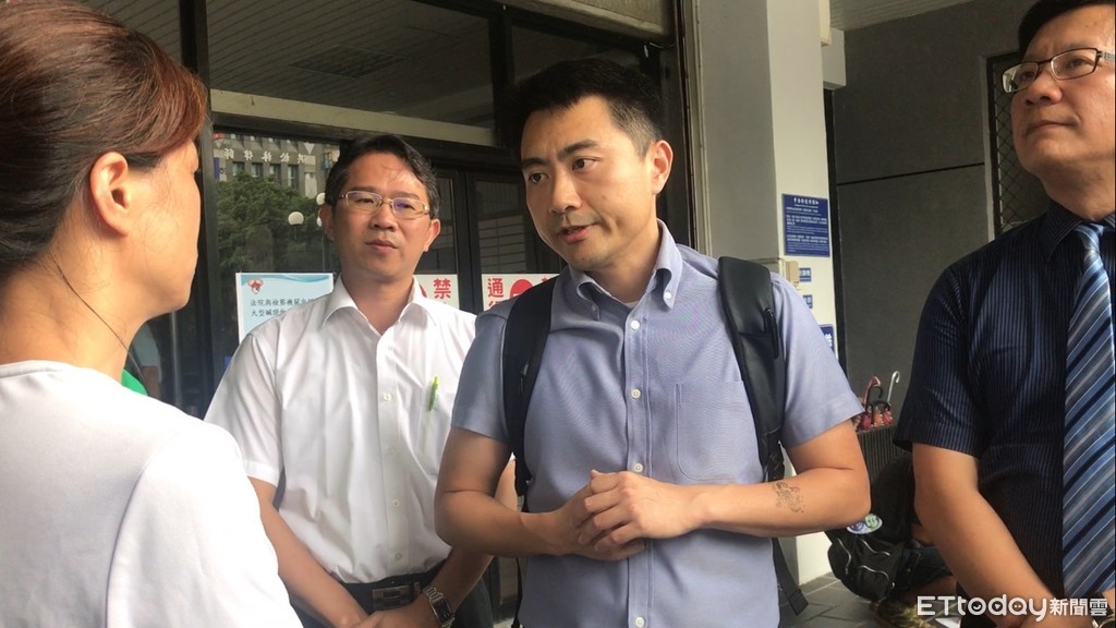 ▲林佳龍競選總部副主委張廖萬堅(右二)、民進黨台中市黨部主委何明杰(右一)與律師李宣毅(左二)到台中地檢署遞狀控告對手異圖使人不當選。(圖/記者李忠憲攝)