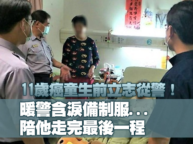 就讀佳冬國小五年級的「抗癌小勇警」林存家(11歲),由阿嬤一手帶大,祖孫倆相依為命,生活雖然清苦,但懂事的他總會串珠、畫畫義賣幫忙家計,無奈老天捉弄人,國小三年級時被診斷出罹患「急性骨髓白血病」,勇敢抗癌2年多仍不敵病魔於8月28日離世。而他最大的願望就是當警察,高雄警方得知後特別在告別式上送上一套警察制服,陪他走完最後一程。