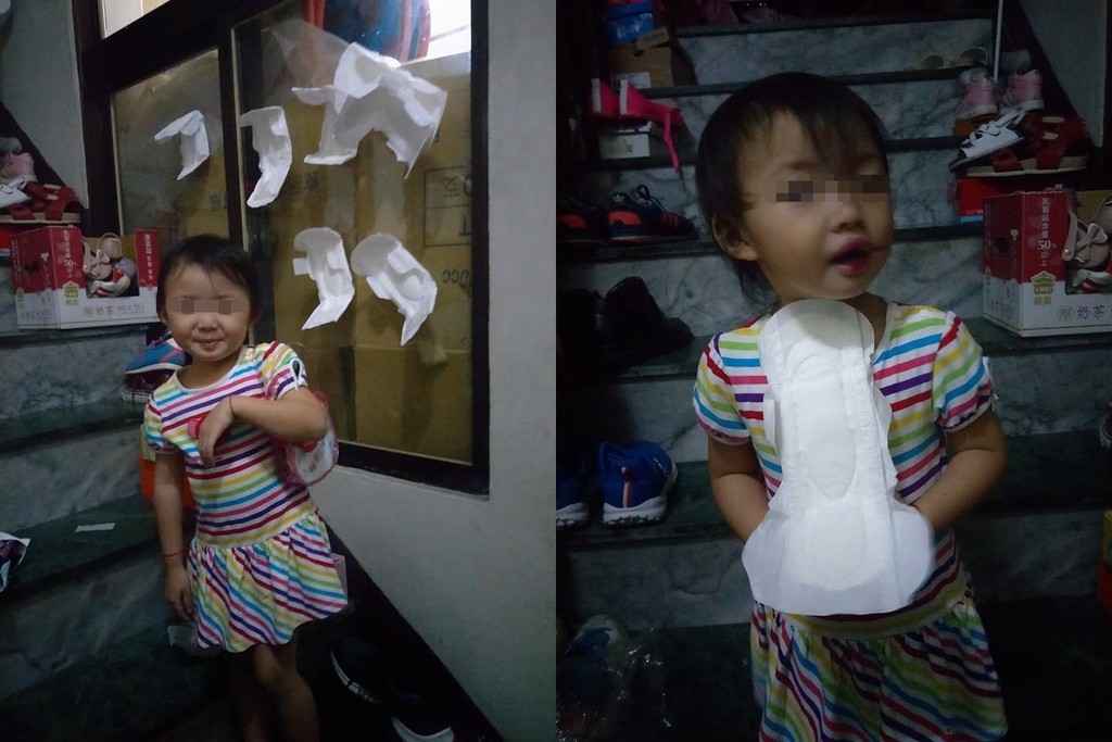 女網友在社團中貼出3張照片,只見透明的玻璃窗上貼滿了衛生棉,根本是把衛生棉當作壁紙,女兒還在一旁得意地笑,完全沒有意識到自己闖禍了,女網友說說,「洗個澡出來,看到這情形,不知道該哭還該笑」,她開玩笑地說,這是「符咒貼滿的概念嗎」?