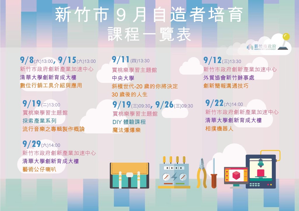 為培育青年自造創新人才,新竹市政府創新產業加速中心9月份推出多元的創客課程,包括創新簡報溝通技巧、數位行銷工具應用、相撲機器人及藝術公仔喇叭等。市長林智堅鼓勵青年朋友踴躍參與,以提升自我競爭力。