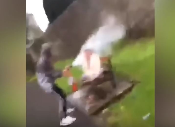 ▲ 2名少年拿滅火器對準婦人臉部噴灑,冒出陣陣白煙 。(影片翻攝自Imajsaclaimant臉書)