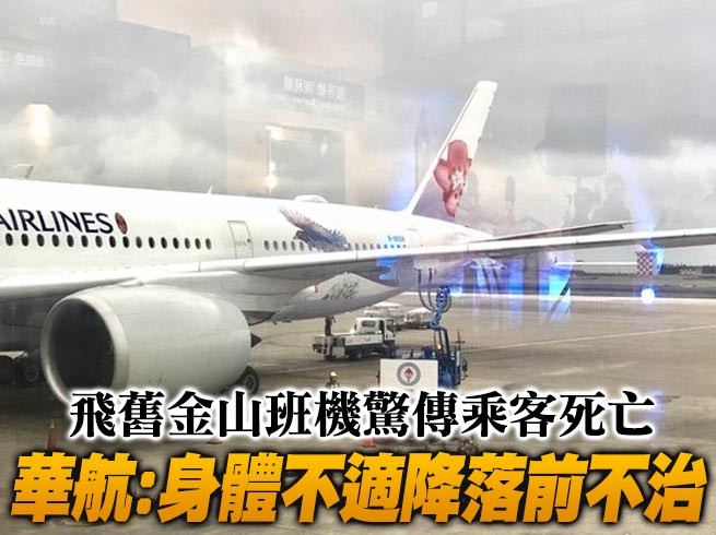 中華航空CI04班機從台北飛往舊金山途中,驚傳有一名乘客死亡。華航稍早證實,班機在當地時間7日晚間降落前,一名旅客因身體不適失去意識,緊急請地面預備救護車,但不幸的在抵達舊金山機場前,該旅客已經失去生命跡象。