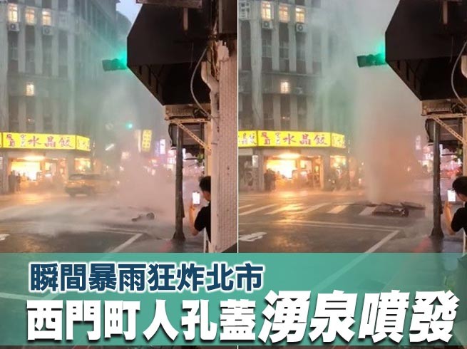 傍晚北台灣突然降下豪大雨,北北基時雨量破百毫米。台北市西門町內江街和昆明街口一處人孔蓋疑似也因為瞬間暴雨被沖起,整個人孔蓋噴飛到2、3層樓高空,雨水也瞬間噴出如同噴泉,嚇壞來往的路人。