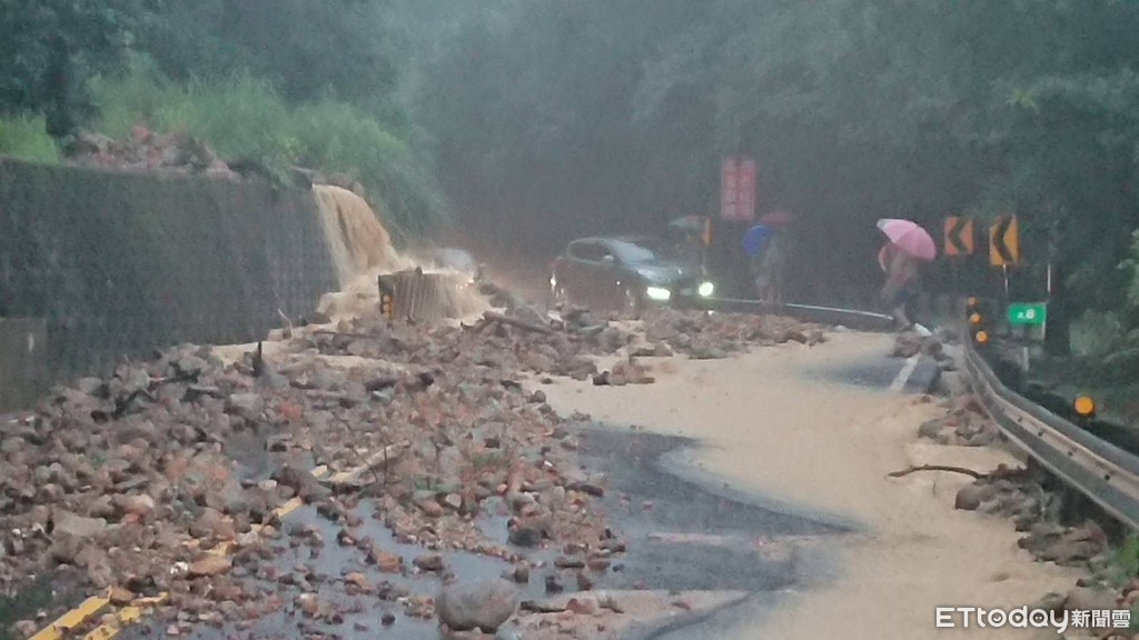 新北市金山區9日出現豪大雨,上午7時10分台二甲線陽金公路8.8公里處,因豪大雨造成土石崩落於路面上,大量土石及黃泥沙遍布數10公尺,導致交通中斷,雙向道路目前都無法通行。警方已到場警戒並封閉車道,現場並無人車受土石壓住的情況,所幸無人員受傷,已通知金山區公所進行搶修,目前景美工務段已搶修單線通車。