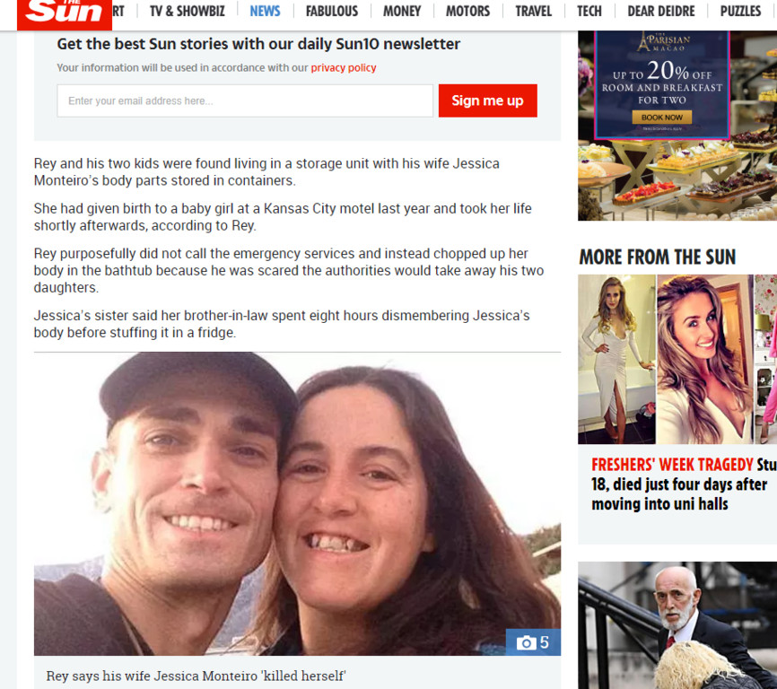 36歲的美國男子雷伊(Justin Rey)先前被發現,跟兩個孩子住在迷你倉庫中,同時該倉庫裡發現一個裝有他的妻子潔西卡(Jessica Monteiro)身體部位的容器。據悉,潔西卡2017年時在一間汽車旅館裡生下一名女嬰,隨後自殺身亡,而雷伊則決定將妻子身上的皮剝下,分屍後塞到冰箱裡,然後把無法沖進馬桶裡的器官裝在容器裡,隨身攜帶,這樣才能讓「全家人」團聚。
