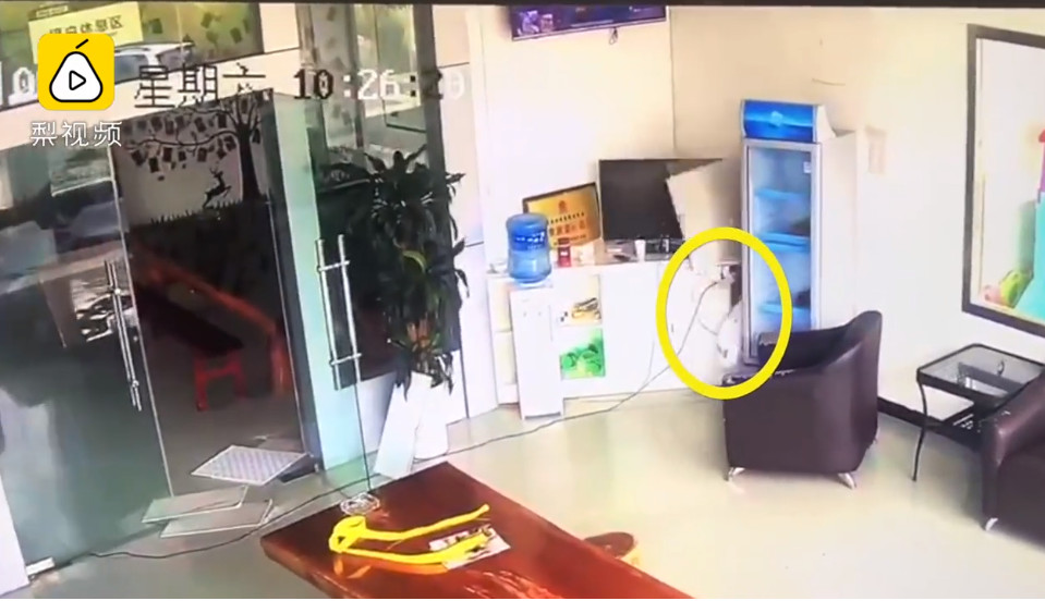 監視畫面中,一名小男童坐在沙發上面發呆,看似平靜的場景突然劇烈搖晃,天花板突然崩落,原本坐著的小男童趕緊起身,躲進衣櫃與電視櫃的夾縫中間,接下來的畫面超級驚險,小男童只差1秒就要被天花板崩落直下的板子砸中,所幸緊急逃生才躲過一劫。