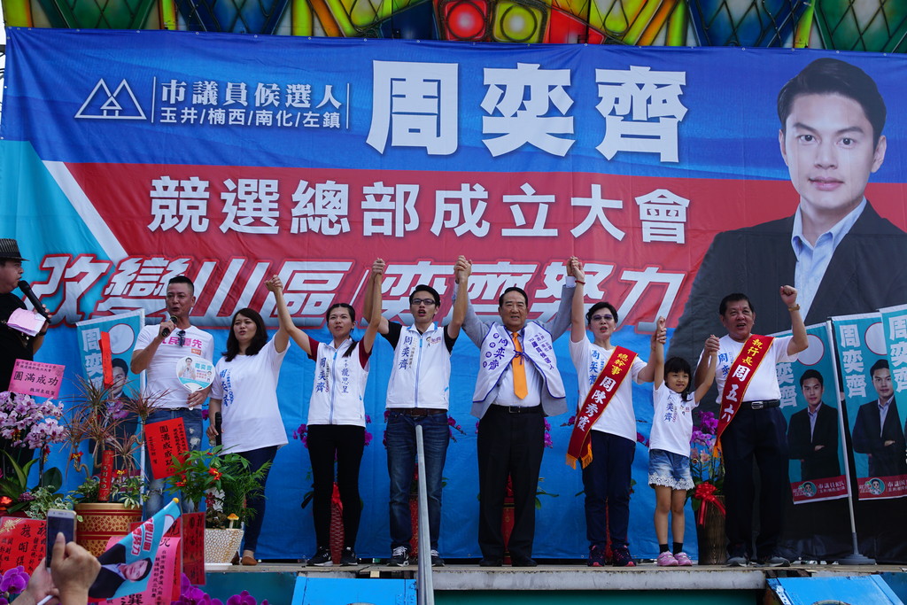 親民黨主席宋楚瑜9日上午在立法委員陳怡潔、組織部主任張碩文的陪同下,南下台南玉井區為無黨籍市議員候選人周奕齊站台,在致詞時提當省長時對台南的道路建設,更直言,「哪個候選人不希望我去站台」,炒熱現場造勢氣氛。