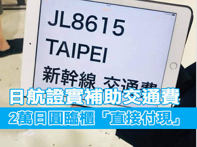 對於補助交通費消息,日本航空台灣分公司總務部總經理吳昌齡證實,日航確實有針對因受颱風影響行程的旅客交通費補助,主要補助對象為原訂往返台灣-大阪,但因航班取消而改乘台灣-東京成田加班機的旅客,只要在機場櫃檯出示搭乘東京成田-大阪新幹線的交通票券,就可立刻拿到2萬日圓的補助費用,由於適用時間尚待總部確認,詳細補助辦法可向日航客服洽詢。