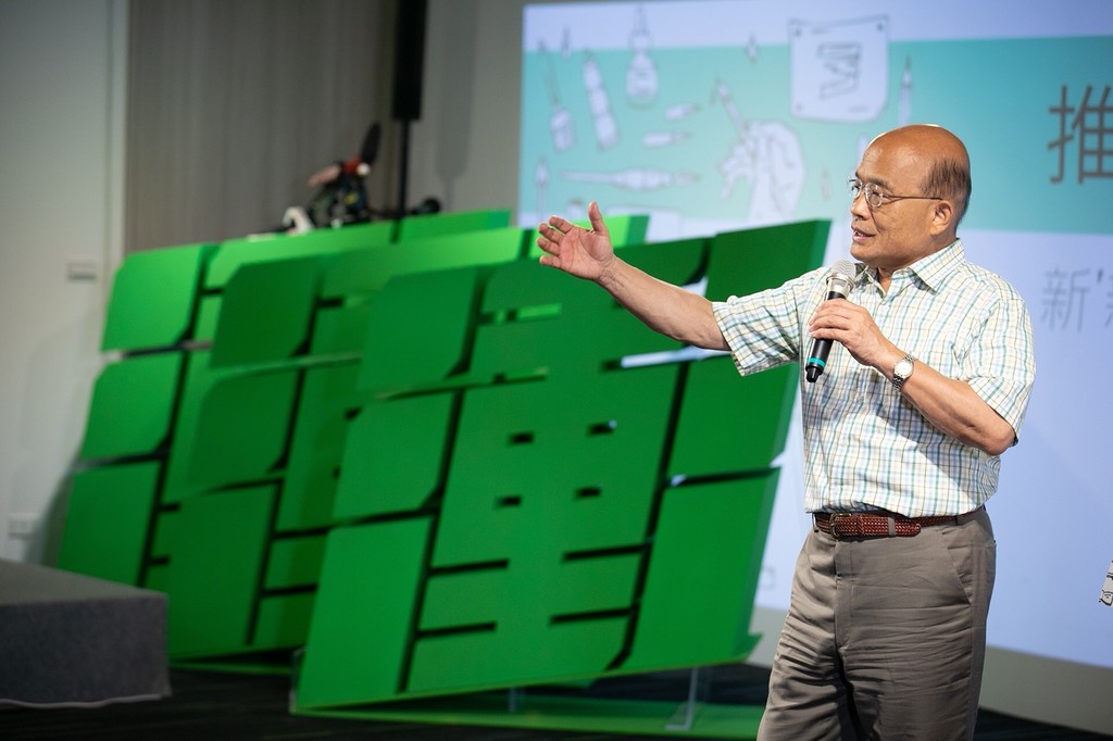 幕僚團隊也會仔細計算背板的投影高度,讓直播框中的蘇貞昌移動時,也可以展示整個政策主題,讓觀看直播的網友們一覽無遺。