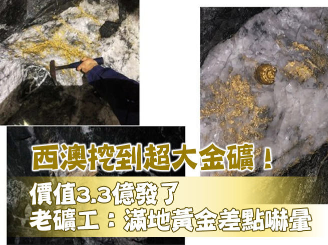 西澳大利亞小鎮坎博爾達(Kambalda)礦工在一處準備拍賣的礦場裡挖到罕見大量金礦,總價值高達1500萬澳幣(約3.3億新台幣),其中最大的一塊原石重達95公斤,單塊預估就有2300盎司的含金量。連地質學家也驚呼,這種事絕對是「一生一次的機會」。