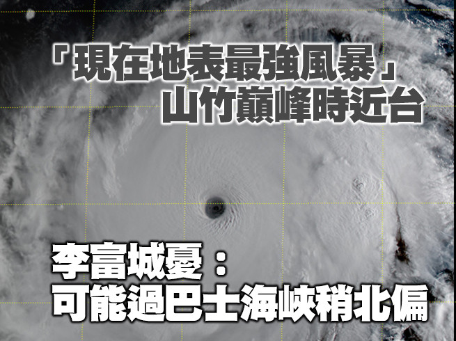 中央氣象局預報員王品翔表示,強烈颱風山竹周五(14日)下半天到周日(16日)早上最接近台灣,周五有機會發海上颱風警報,但陸上颱風警報還不確定。氣象專家李富城憂心指出,山竹可能過巴士海峽稍微往北偏一點,「這對台灣來講是非常不好的颱風」。氣象專家吳德榮則說,目前各大洋共有7個熱帶系統,山竹堪稱此時「地表最強風暴」。