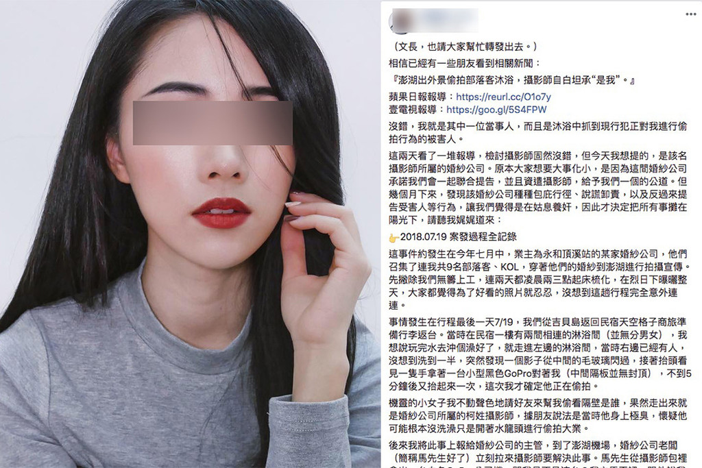 柯姓攝影師涉嫌偷拍入浴畫面,其中一位被害者YuYu在粉絲專頁發文坦承「沒錯,我就是其中一位當事人,而且是沐浴中抓到現行犯正對我進行偷拍行為的被害人。」網紅表示,案發當天她與其他部落客、網紅等到澎湖進行拍攝宣傳,在拍攝日的最後一天時,當她在沖澡時發現毛玻璃有個影子閃過,接著抬頭看就發現一台小型黑色GoPro對著我,「不到5分鐘後又抬起來一次,這次我才確定他正在偷拍」。