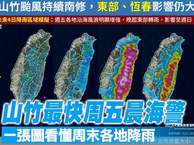 中央氣象局預報員劉沛滕表示,最快周五(14日)清晨到上午發布強烈颱風山竹的海上颱風警報,至於陸上颱風警報機率相對低,颱風外圍環流當晚就會影響東半部和南部地區,周六(15日)可能有大雨或豪雨發生機率。氣象專家李富城提醒,颱風「帶來的雨勢非常非常驚人」,但路徑偏南對台灣陸地影響減少,將切過菲律賓。天氣風險公司也製作一張圖,讓民眾了解周末全台各地下雨情況。