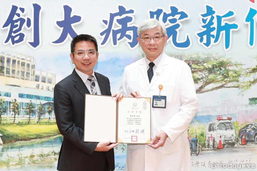 ▲▼將卸任的陽大附醫院長羅世薰(右)獲宜蘭市長江聰淵頒發榮譽市民證書及之鑰。(圖/記者游芳男翻攝,下同)