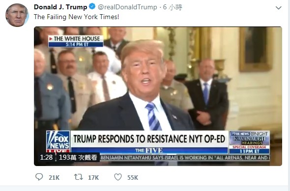▲川普在匿名投書曝光後強烈譴責。(圖/翻攝自川普推特)
