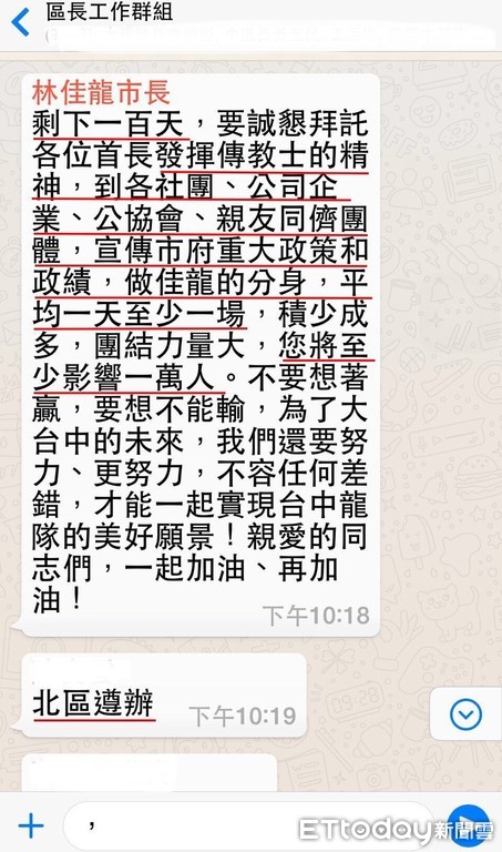 ▲市長林佳龍在區長群組傳訊息,請大家幫忙打選戰惹議。(圖/盧秀燕服務處提供)