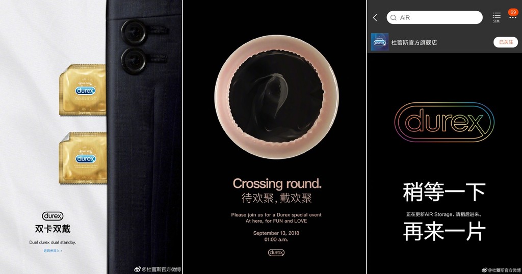 蘋果在當地時間12日早上發布iphone新品發表會,受到各界關注,結果知名保險套品牌杜蕾斯(Durex)大陸官方在同天釋出幾張平面廣告圖,內容都是搞笑模仿iphone的風格,被網友讚爆說,「美編是被保險套事業耽誤的哏王」。