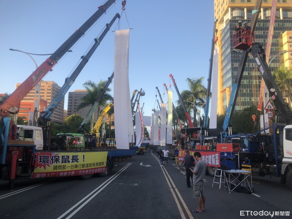 ▲▼多輛吊臂車紛紛伸起吊臂,布條上宣示不同訴求。(圖/記者趙永博攝)