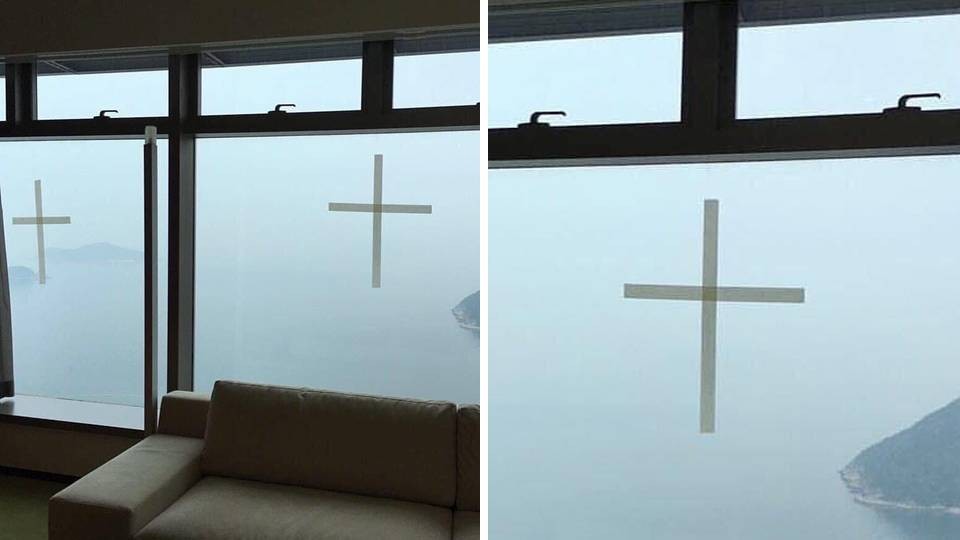 今年最強颱「山竹」暴風圈可能掃過台灣南方近海,已在上午11時30分發布海警,以每小時24公里的速度朝西北西移動。有香港民眾提早進行防颱措施,請女傭在玻璃窗貼膠帶保護,沒想到卻驚見大大的十字型圖樣,如此特別的作品,讓網友笑歪直呼「阿們!」