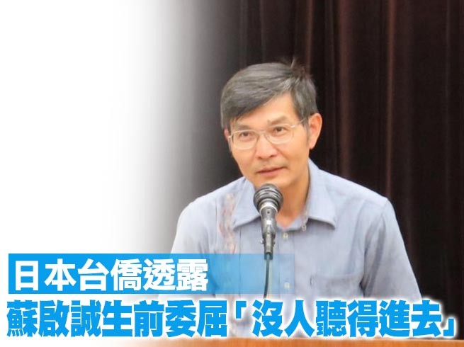 我國駐日本大阪辦事處處長蘇啓誠14日驚傳輕生,親友聞訊悲痛難以接受,么弟夫婦已趕往日本處理善後,外交部也將全力協助家屬處理後續事宜。蘇啓誠疑似壓力過大輕生,對此,旅日台僑王輝生下午接受《自由時報》專訪表示,他曾聲援蘇啓誠,但蘇卻回「這沒有用的,台灣的媒體沒人聽得進去!」