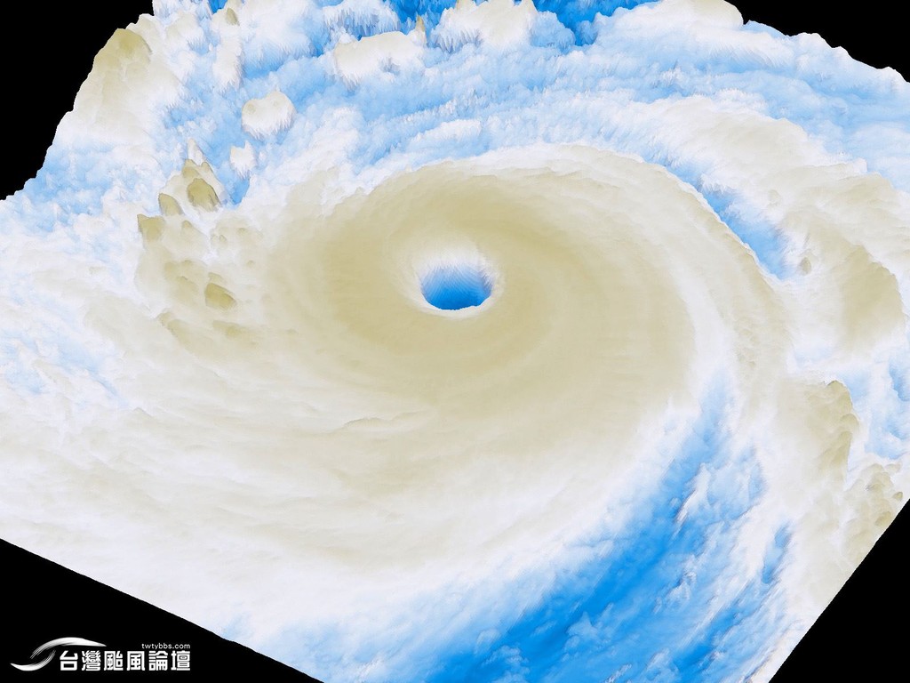 臉書「台灣颱風論壇|天氣特急」14日下午PO出一張「3D山竹照」,雪白與淡鵝黃色的厚實雲層摻雜,依著偌大的颱風眼緩緩旋轉,宛若棉花糖ㄧ般的唯美景象令人不難想像山竹的破壞力有多大。