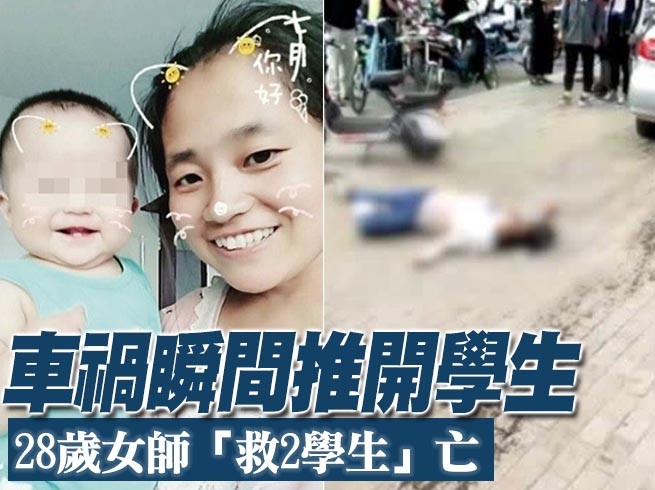 大陸內蒙古呼和浩特一名28歲女教師丁燕桃發現一輛汽車失控、要撞上2名學生時,奮不顧身將對方推開,自己慘遭自小客車輾過並拖行好幾公尺,送醫途中不治身亡。丁女的丈夫表示,再3天就是女兒滿1歲的生日,「孩子每天都想媽媽,卻不知道永遠也見不到媽媽了。」