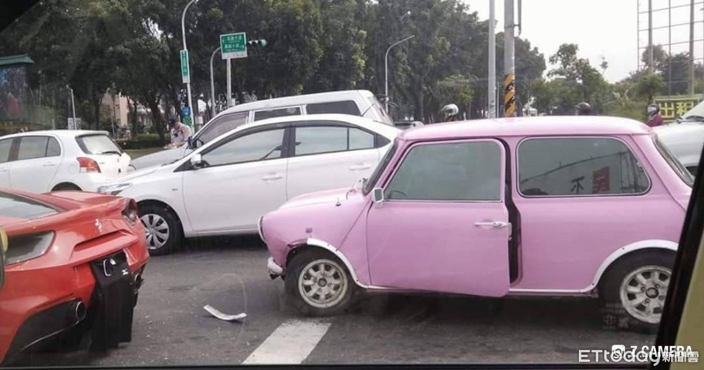 ▲▼ 粉紅色MINI 奧斯丁小車,疑似變換車道不慎撞上火紅法拉利跑車。(圖/記者翁聖勳翻攝)