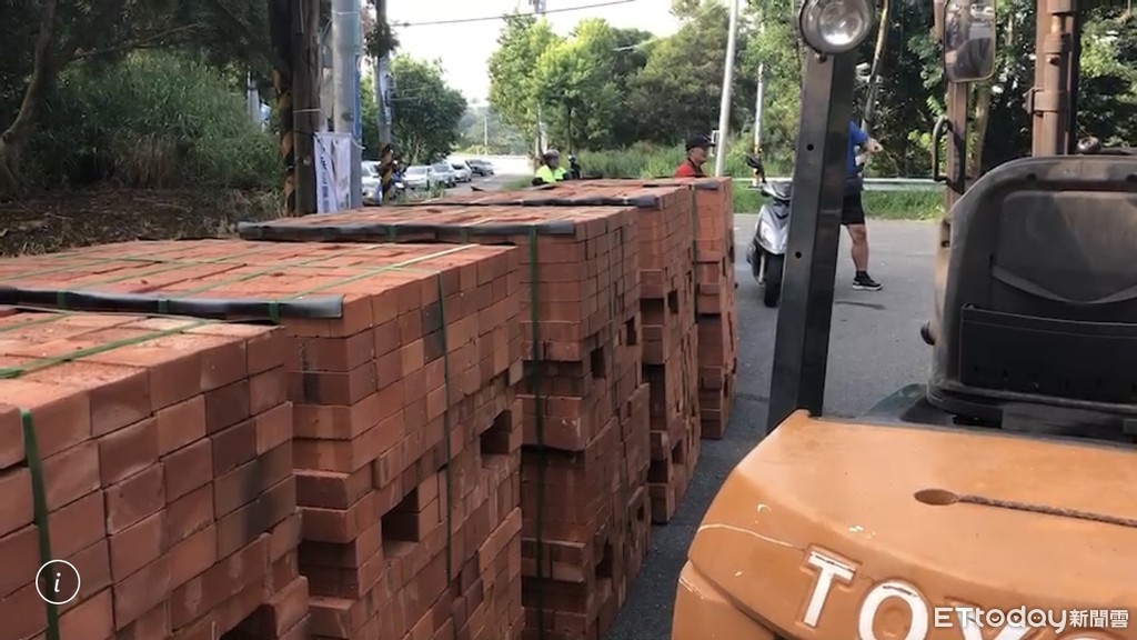 ▲現場先將拖板上的磚塊移至路旁。(圖/記者李忠憲翻攝)