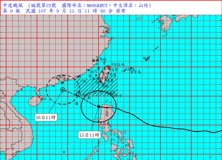 氣象局簡任技正伍婉華表示,第22號颱風山竹中心於9點前後由呂宋島北部陸地進入南海,清晨到早上這段時間受到呂宋島地形破壞,中心最大風速從每秒51公尺減弱每秒 48 公尺,也讓山竹從強烈颱風減弱成中度颱風,至於七級風暴風半徑維持 300 公里,環流影響仍顯著。後續會持續向西北西移動,對巴士海峽、東沙島海面、台灣東南部海面及台灣海峽南部持續構成威脅。