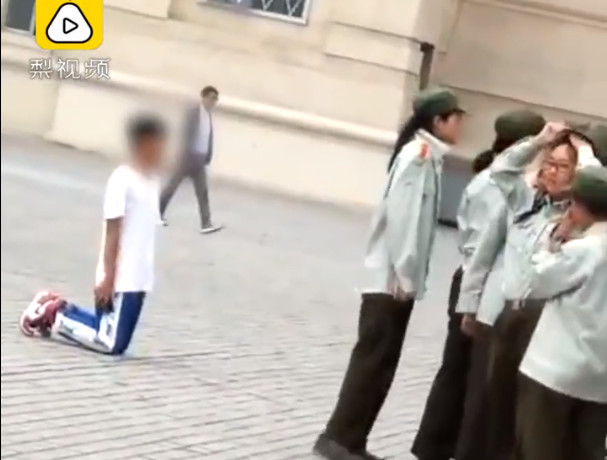 從側拍影片畫面可見,一群高中生正在校內軍訓聽課,旁邊卻有一名穿著運動服的男學生華麗下跪,背部還挺得超直不鬆懈,途中雖然有拿出手機看一下,但立刻收起繼續賠罪,模樣超級認真。
