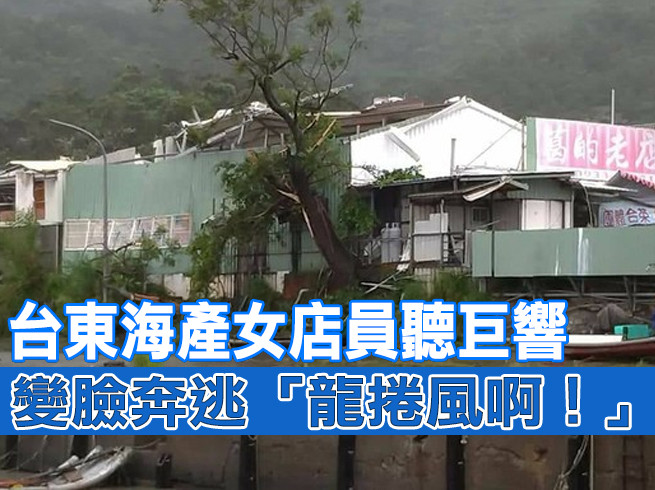台東日前受到山竹颱風外圍環流影響,大武鄉大武漁港突然掀起一道龍捲風,當場橫掃整個尚武村,造成許多民宅屋頂全毀,一段監視器畫面還原當時恐怖情景,一家海產店員工正在整理桌椅,突然感受到外頭巨響,一看不得了,竟是龍捲風襲來,趕緊在屋內找遮蔽物蹲下躲藏,網友看完畫面全嚇呆,直呼「瞬間根本被炸彈炸到一樣!」