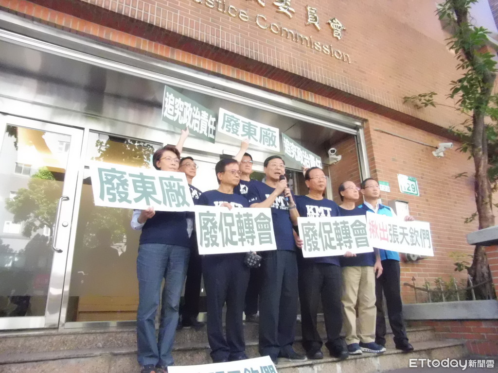 國民黨立法院黨團17日派出9名立委突襲促轉會,除了高喊「廢東廠、廢促轉會、揪出張天欽們」,還把東廠貼滿促轉會門口,費鴻泰更是賣命爬梯上二樓把「東廠」貼在促轉會的招牌上。