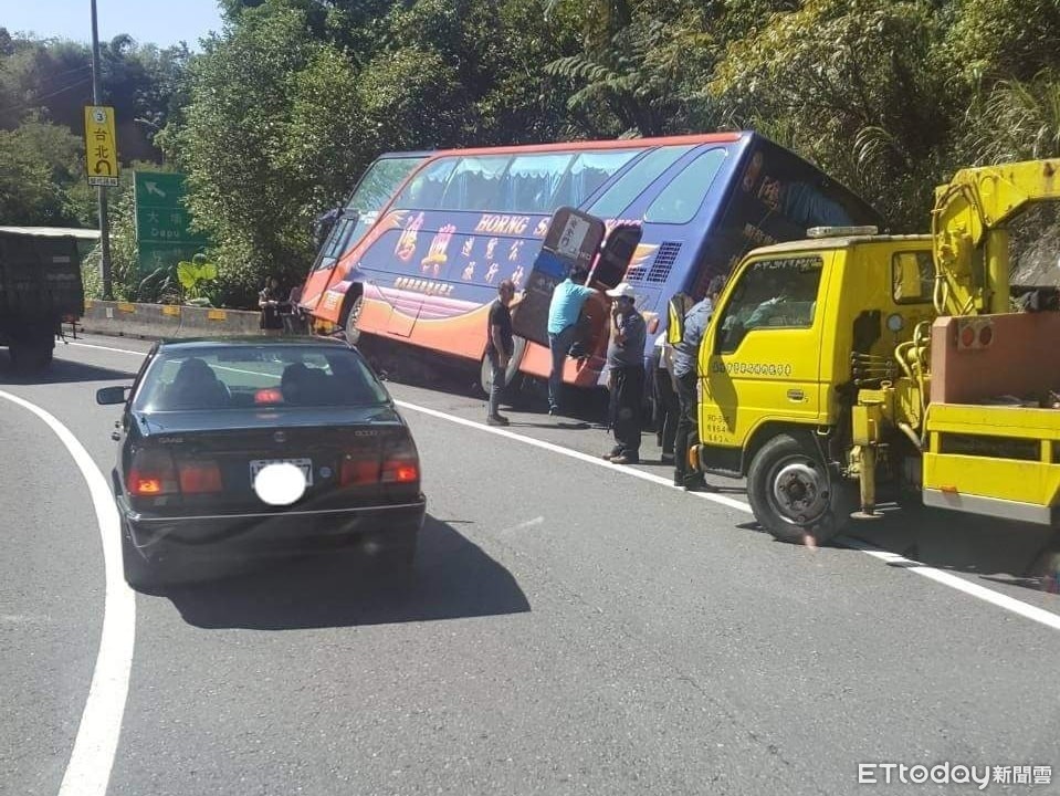 ▲大埔匝道發生車禍,遊覽車撞山壁,20多人受傷。(圖/翻攝基隆人大小事臉書社團)