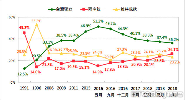 民調分析,近兩年來,台灣民眾的統獨傾向,確實發生戲劇性變化,期盼「兩岸統一」,從15%上升到26.1%、支持「台灣獨立」,從51%銳減到36.2%、主張「維持現狀」則大多在25%左右徘徊。
