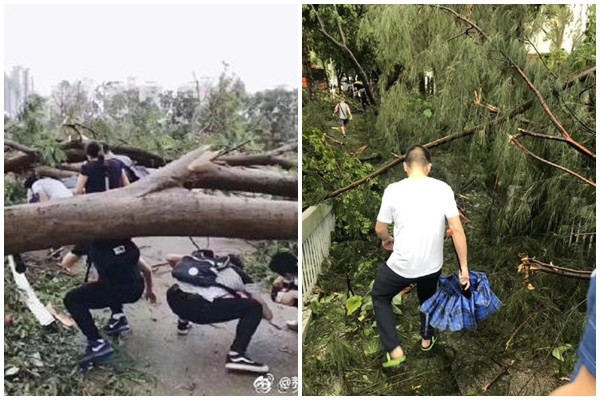 山竹造成路上的大樹都被吹倒,深圳福田區梅華路短短300公尺的街頭就有20棵大樹倒下,但風災過後的可怕模樣,似乎沒有讓上班、上課的人退縮。從被上傳至網路的影片與照片上來看,市民不管穿著裙子還是褲子的,都紛紛爬上已倒下的樹木,往目的地前進,還有人像駭客任務的主角一樣彎腰穿過樹與地面的縫隙,每個人都像是在闖過一道道的「叢林障礙」。