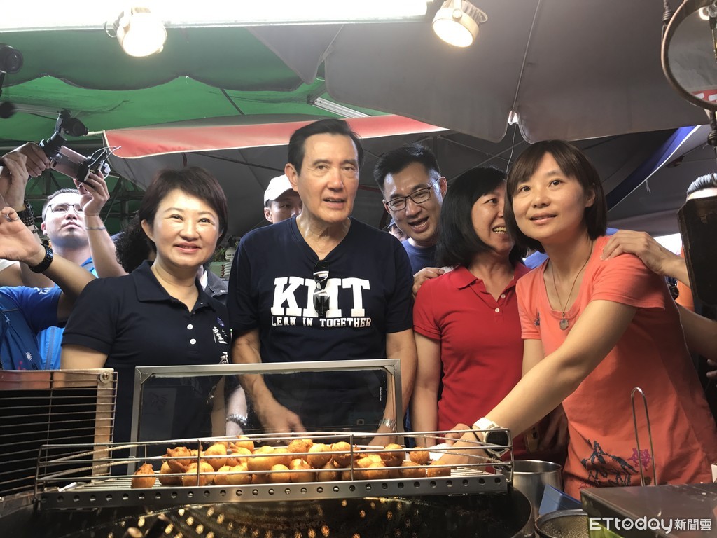 ▲盧秀燕與前總馬英九、立委江啟臣與廟東夜市攤商合影。(圖/記者李忠憲攝)