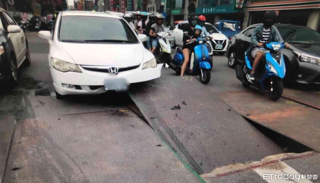 ▲▼小轎車遭翹起鐵板卡住,導致後方騎士閃避不及追撞受傷。(圖/記者林悅翻攝,下同)
