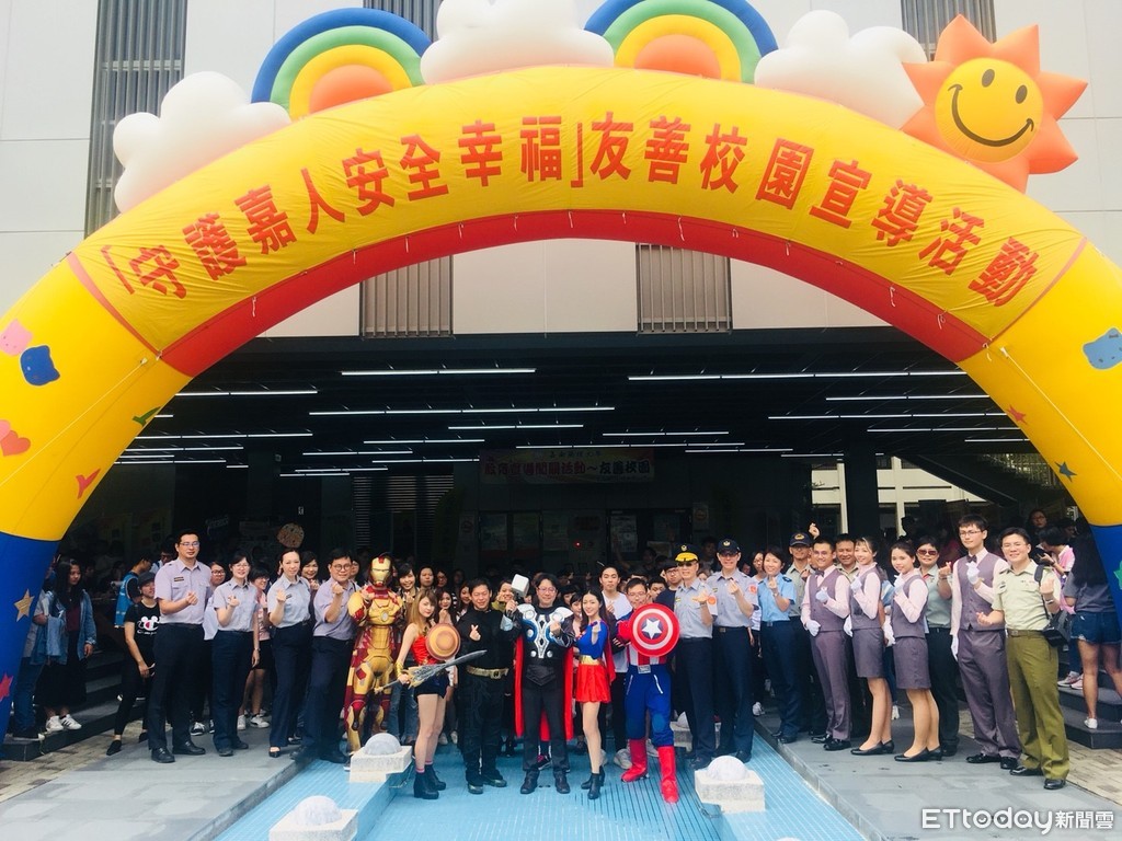 ▲台南市警局宣導團與超級英雄一同出現在嘉藥校園,別出心裁一同cosplay演出。(圖/警方提供)