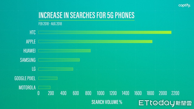 根據國外研調公司Captify報告,消費者關注宏達電推出5G手機的程度,統計6個月,民眾打上HTC+5G等關鍵字,搜尋量與去年同期相比成長幅度高達2115%,達21倍,蘋果則為1819%、華為829%、三星655%、LG 543%、Google Pixel 293%、摩托羅拉186%。