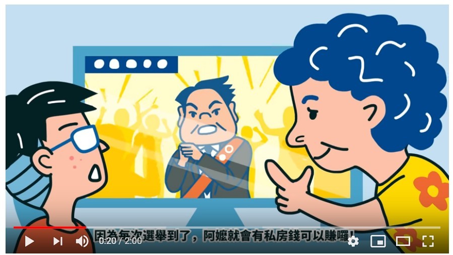 宣傳短片裡,阿嬤原本很開心選舉到了又有「私房錢」可以拿,因為候選人若來買票,家裡包括阿公阿嬤、爸爸媽媽一共四張票可以賺個好幾千,但被孫子知道後勸阻,因為調查局的叔叔有來學校做反賄選宣導讓他知道,買票就是賄選,賣票的人也一樣犯法。