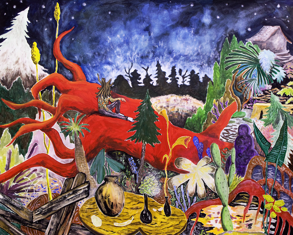 「我」在無名的荒野叢林裡信步晃蕩、晃蕩,眼見有一鮮紅淋淋的巨木如逃兵臥倒,輕撣灰塵,我單腳屈膝坐落。灰白樹皮與奼紫色的枯樹枝穿入夜幕,精雕舊玻璃檯燈、破爛酒紅色沙發、鋸斷面光滑的木材、各色泥土盆器、露營營火鐵桶以及不堪用的帳篷殘布數匹四散於周圍,各類植物蠻橫地生長,浸潤今夕月色,反射著不屬於它們應有的怪異色澤,整個世界悄然無人聲,整座叢林彼此用顏色對嗆。經過一間廢棄木屋,牆上一面鏡子,「我」看不見人臉,只有一張滿佈蓬鬆葉子的慘綠面容,此時一片葉子不堪於我微弱的身體震動,虛弱地,被抖落下來。