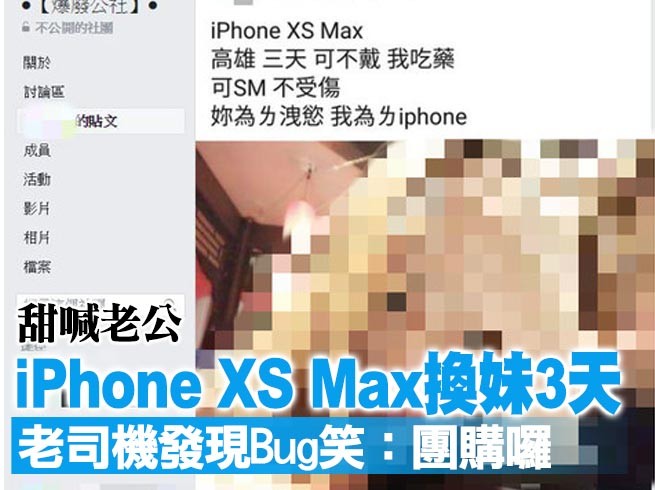 史上最貴蘋果旗艦新機iPhone Xs Max,頂歸售價飆破5萬,嚇退許多民眾。一名正妹日前在臉書po文,為了這款iPhone,她願意獻上肉體3天,同時可不戴套、可SM等;貼文狂吸各路老司機朝聖,大多數人喊貴,但還是有不少網友笑說,「可以團購嗎?」、「沒限定人數啊,樓下開始報名,統計到中秋節」。