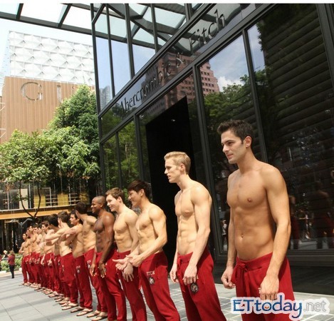 美國服飾品牌A&F(Abercrombie & Fitch)第三家亞洲旗艦店即將在新加坡Knightsbridge開幕,日前邀請來自巴西、美國、法國、日本、義大利等40名身穿紅色運動褲、裸半身的猛男站台造勢,吸引眾多民眾搶拍。據悉,這40名猛男將從每天輪流站在店外,直到15日旗艦店開幕為止。