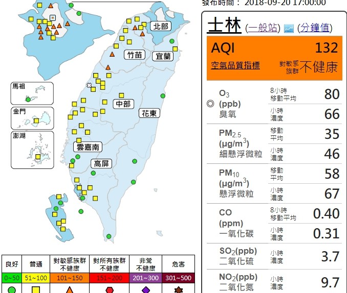環署指出,其中最嚴重的前3處為古亭空品指標達140,松山136和士林132,主要是環境風場為偏東風,西半部地區位於背風面,擴散條件較差,導致北部到中部的污染物持續累積,局部地區甚至可能會有影響民眾健康的紅色警示等級。