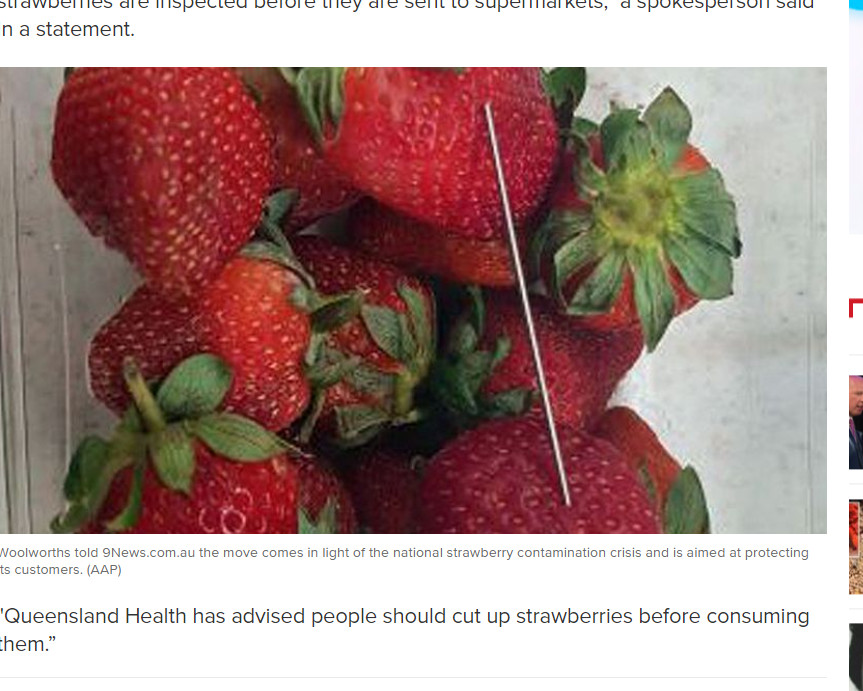 根據《9news》報導,澳洲昆士蘭上周傳出超市草莓藏針,接著爆發在新南威爾斯、維多利亞、塔斯曼尼亞共6地區。就在草莓藏針事件進入調查後,新南斯威爾省17日一位民眾到超市買了芒果,放置兩天後切開,卻發現果肉出有一根銀針,立即報警。這起草莓藏針事件,還延燒到造成100名以上的草莓工人失業。